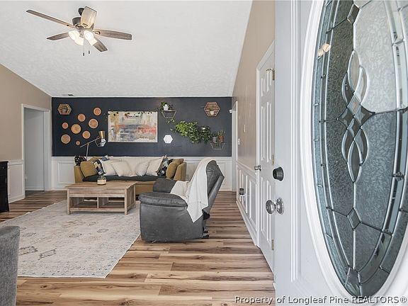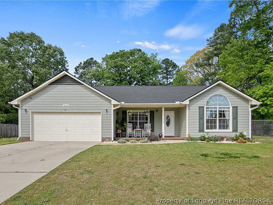 Welcome to this charming ranch nestled in the Lake Rim North subdivision! This home boasts a split floor plan, offering privacy with 3 cozy bedrooms and 2 bathrooms. No carpet with laminate flooring throughout, ensuring both durability and elegance. The heart of the home, an inviting eat-in kitchen, beckons with gleaming granite countertops and chic white cabinetry with tiled backsplash, perfect for all your culinary needs. The primary suite features dual closets, garden tub, separate standing shower and linen closet. Step outside to discover the fenced backyard oasis, complete with a spacious deck, ideal for unwinding under the Carolina sky or hosting gatherings. Conveniently located near shopping, dining, and with a seamless commute to Fort Liberty, this residence epitomizes comfortable living with a touch of Southern charm.