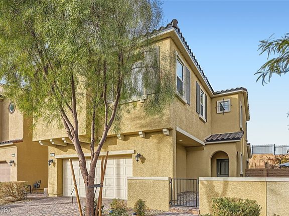 Built in 2021!! This home is pristine and ready for move in. Located in the northwest master planned community of Skye Canyon in the gated community of ASPEN. Skye Canyon offers lots of walking trails, community clubhouse w/pool & spa, fitness center, basketball, tennis and pickleball courts, playgrounds & so much more! With 2002 sq. ft. this home offers 3 beds, tech loft, 2.5 baths & 2 car garage with courtyard entry. The standout kitchen includes iron grey cabinets w/custom knobs, upgraded quartz countertops, LARGE kitchen island w/pendant lighting, designer backsplash, stainless steel appliances INCLUDING refrigerator! The flooring is a showstopper! Large marble title throughout, manmade laminate on the stairs, hallways & one secondary room. Adjoining style bathroom between bed 2 & 3. The primary bedroom is HUGE, includes custom closet built-ins & separate shower/tub. Washer and Dryer INCLUDED! Backyard has been pro landscaped & includes fire pit and covered patio! WELCOME HOME!