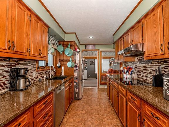 This 3 bedroom, 3 bath split on nearly 14 acres with 3 barns, two with concrete floors and one heated with upgraded electric, provides so many options! It even has additional living space on lower level with kitchenette, full bath, sleeping and recreation areas. Kitchen and bathrooms updated. Main bedroom easily fits king bed and has private bathroom. Additional bedrooms have unique design to separate bed from sitting and dressing areas or to provide separation between two beds. One bedroom has a wall of built-ins. Four season room main level and flex room on lower level provide additional apace for your specific needs. The property features a stocked pond with quaint covered bridge. There is also a beautiful wooded area to enjoy. Formerly a horse property, can easily be returned to horse friendly. RV pad with 30 amp service. Barn space for additional 3 cars(5 total). Decking across bac of house to enjoy the stunning views. Off the grid? Workshop? Hunting? Fishing? Home Schooling? Small Farm? Animals? And and all accommodated by this special property.