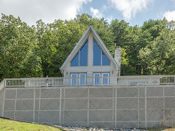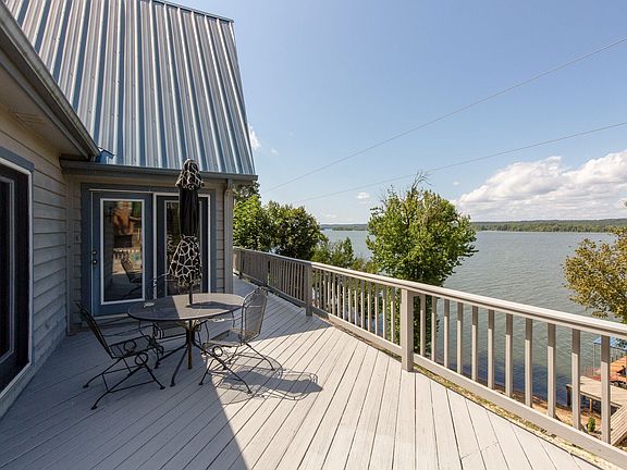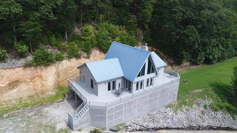 Beautiful waterfront A-Frame home on Kentucky Lake with spectacular views of the river. Boat dock with two slips. 3 bdrms and 2 FB and a loft up top this house is perfect for the whole family! Basement has 2 garage doors with plenty of room for boats! Internet is available! Brand new HVAC and waterheater, new countertops, deck freshly painted.