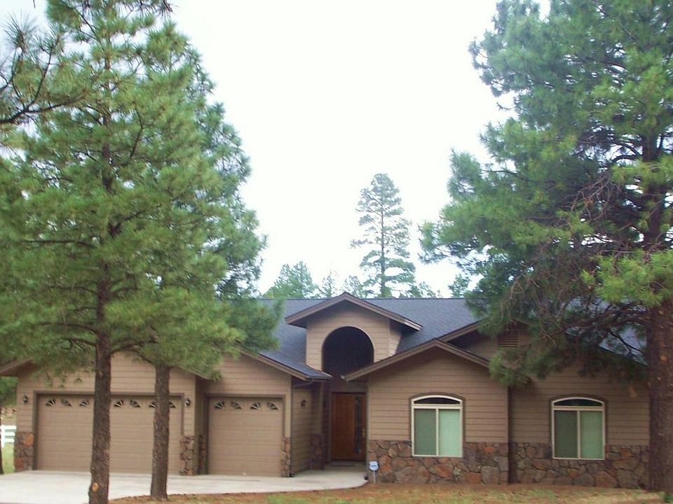 Borders National Forest on Two Sides. Almost New Custom Home with 2.25 Acres of Tall Ponderosa Pines. This single level home with 3 bedrooms and a den, has a split floor plan, central air conditioning, and an attached and insulated three car garage. The HUGE kitchen has travertine tile, granite counter tops with plenty of space, hickory cabinets, stainless steel appliances, breakfast bar, pantry, and a range top with under the floor exhaust. The kitchen is open to the great room and perfect for entertaining. There are lots of oversized windows to take in the views of the forest. The large master suite has its own master bath with a jetted tub and separate shower, double sinks, and a huge custom walk-in closet. Peaceful and tranquil setting, less than 6 miles to Flagstaff Mall.