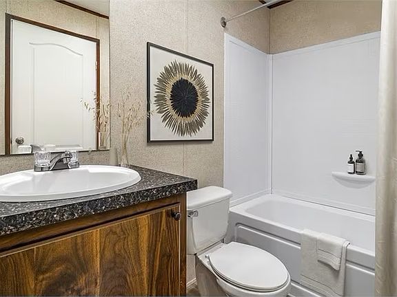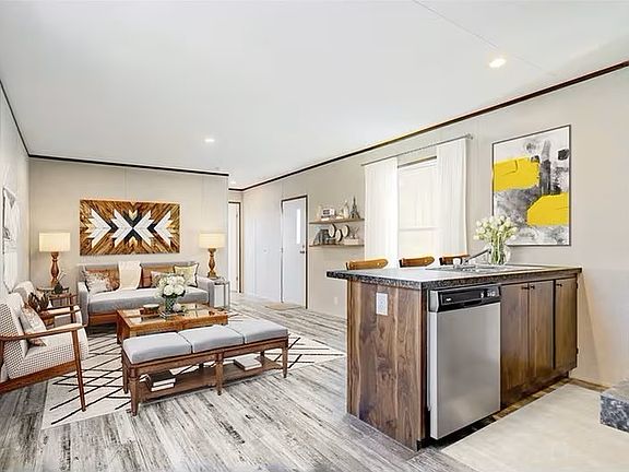 Spacious three bedroom and two bathroom mobile home with an open concept kitchen and living area. Kitchen features dark counters and wood cabinetry, stainless steel appliances, kitchen island with countertop seating area, all open to the living room. Master suite is separate from the other two bedrooms and guest bath in hallway. Laundry room is tucked away in separate hallway and includes full size washer and dryer.
