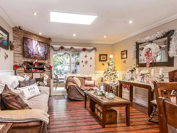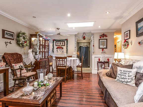 Crown mouldingsUpdated lightingRecently upgraded kitchen appliancesSunny deckCovered sitting area
