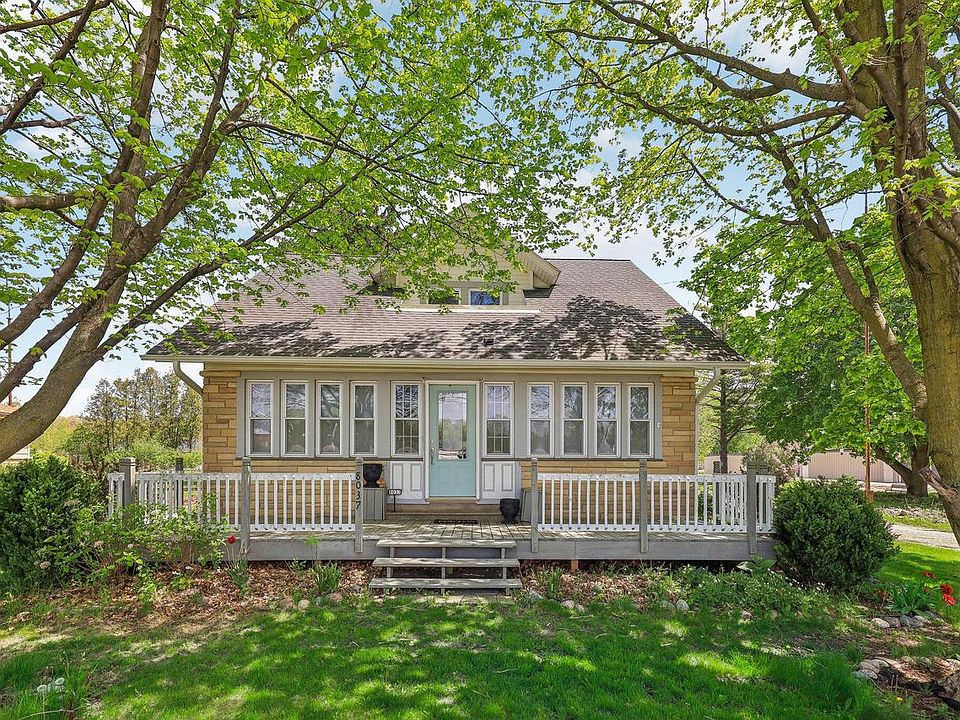 Super cute cape cod situated on just under an acre complete with 2.5 garage PLUS shed and coop/garden! Three bedrooms. Large living room and dining room combo. Remodeled kitchen complete ceramic tile backsplash and appliances, AWESOME large, window filled three seasons room Upper level boasts two bedrooms, full bath plus changing room! Main floor has MBR. Garage has additional 11X30 covered sitting area. Back yard boasts huge deck and fire pit!