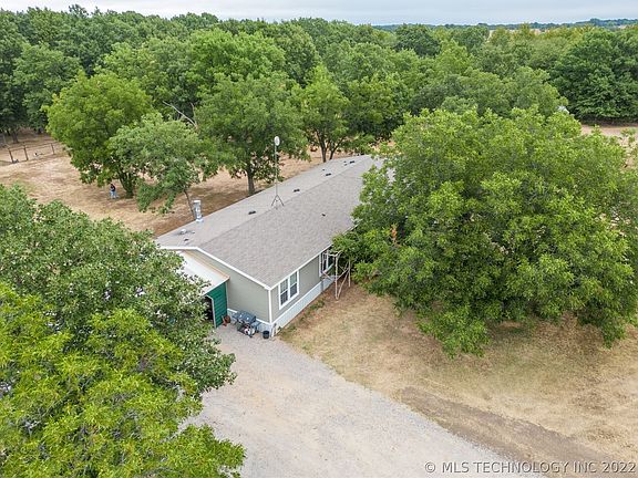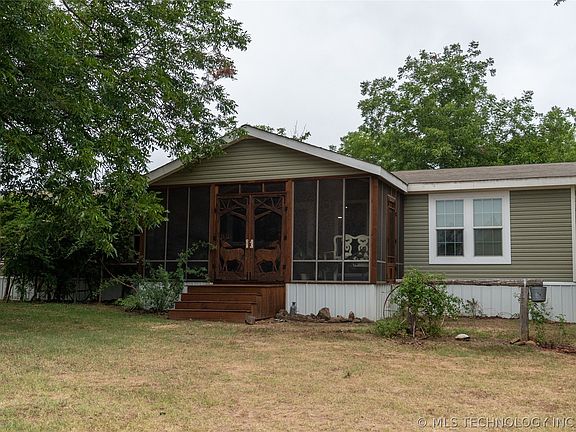 Very well-maintained 4 bedroom, 3 bath mobile home permanently- affixed on 24 acres m/l metal entrance with cattle-guard on a nice paved road, fenced 5 strand barbed wire, The gravel driveway is lined with pine trees that lead to a screened-in cedar porch with intricate custom-wooden doors. Home has new waterproof laminate flooring installed. Mature Wisteria are hanging on cedar trellises, 2 beautifully established gardens (one with a small greenhouse and outbuilding), beautiful landscaping, a huge 20x100 lean-to for farm equipment, attached 2 car carport, storage building with roll-up door, storm cellar, cleared pasture for livestock with established roads and crossings, barn with livestock pens, chicken coop, and dog pen. 1 pond stocked with bass. Located 1 mile from town, centrally located between OKC, Tulsa, and McAlester.