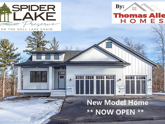 NEW 4bd/3ba SERENITY II at Spider Lake Preserve, a Maintenance Free Community on the Gull Lake Chain. This is 4th lake home being constructed. Model Home is @ 8038 Lost Lake Rd #120. 4 lots are spoken for, which leaves 5 lots for consideration. This community is a small & private single-family lake home community in the City of Lake Shore. This 35-acre community is nestled amongst Lost Lake Lodge, Causeway on Gull, Bar Harbor, Zorbaz, golf courses, and so much more. This private community has its own dock area, lake side patio and firepit area, pickleball court, private crushed granite path system and fine homes built by Thomas Allen Homes. This 4bd/3ba starts at $599k. This particular listing priced with optional sunroom, bonus config as guest suite, custom XL 3rd stall garage, knotty alder custom cabinetry, flooring upgrade & more. Great private master suite and vaulted main aera. Now’s the time to secure your Gull Lake enjoyment in 2024!