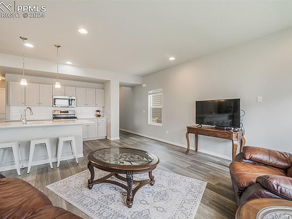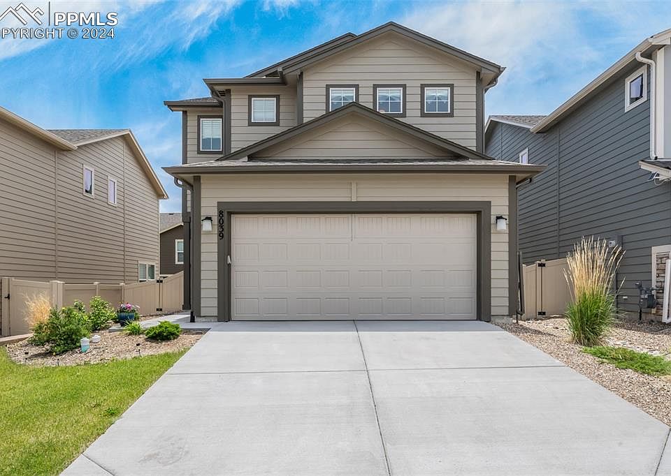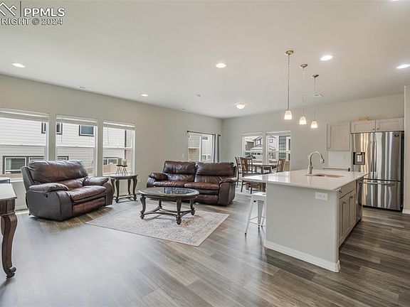 Welcome to this gorgeous home built in 2020, located in the Enclaves at Mountain Vista. The main level open-concept design featuring a great room, dining area, powder bath and over-sized kitchen make it ideal for entertaining. The beautiful kitchen offers a large island, quartz countertops, and generous sized pantry. Upgrades include a farmhouse elevation, air conditioning, vinyl flooring on the main level, soft close cabinets, stainless steel appliances, and recessed lighting in the kitchen. The upper level of this home includes two bedrooms, a bonus loft, a large laundry room, and the primary bedroom. Enjoy the large primary bedroom with walk-in closet and a stunning attached bathroom with double sinks and walk-in shower. The home is fully landscaped in both the front and back, with back patio and fenced backyard. Just a block away, you’ll find a huge park equipped with a basketball court, workout stations, a playground, walking trails, and plenty of grassy areas. Located near the heart of the Powers corridor and all local conveniences including shopping, dining, entertainment, hospitals and more. Just minutes from Peterson AFB and downtown Colorado Springs. Don’t let this one slip away.