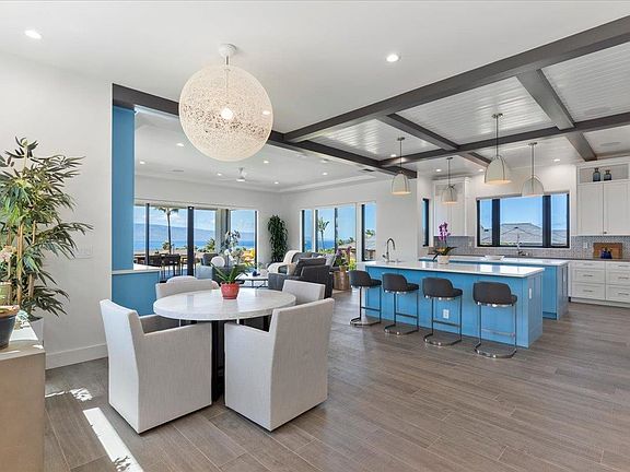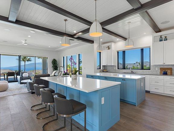Situated atop the distinguished Lanikeha Resort Community in Ka anapali, Lanikeha Residence 63 emerges as an epitome of luxury living, boasting unrivaled panoramas of the Pacific Ocean and the serene islands of Moloka'i and Lana'i. Constructed in 2023, this opulent estate consists of a 4,260 living SqFt main home complemented by a charming 500 SqFt 1-bedroom detached cottage, and sprawls across nearly 6,300 square feet of meticulously designed space under roof. Encapsulating the essence of modern sophistication the home bestows luxurious finishes, state-of-the-art technology, and elegant furnishings curated by Restoration Hardware. The essence of seamless living is embodied through a comprehensive home automation system, enabling effortless control over the residence's ambiance, including music, security, lighting, climate, and more, all at the touch of a digital interface. Upon entry, guests are welcomed by a grand pivoting glass door, revealing the vast beauty of the outer island vistas, setting the stage for an ambiance filled with light and elegance, underscored by soaring 12-foot ceilings, expansive windows, and a palette of light hues. The heart of the home unfolds in an open-concept chef's kitchen and dining area, effortlessly transitioning into a majestic living space that extends to a covered patio, featuring an infinity-edge pool and an integrated heated spa, all designed to create an exquisite indoor-outdoor living experience. The main level is adorned with a sumptuous en suite, boasting a private entry and patio, complemented by a spacious walk-in closet, adjacent laundry facilities, a powder room, and a three-vehicle garage with a discreet rear entrance. Ascend to the upper floor via a broad stairway to discover a bonus theater-room, outfitted with cutting-edge audio-visual equipment, an outdoor deck, and a custom wet bar, making it an idyllic retreat for entertainment or tranquil enjoyment of the breathtaking ocean and island views. Accommodations on the second level also include a guest bedroom with a full bathroom, an additional en suite, a large laundry room, and the master wing. The master suite, positioned to capture the awe-inspiring ocean views, features an expansive bathroom with a curb-less shower, freestanding bathtub, an oversized walk-in closet, and a serene sitting area, crafting a haven of relaxation and luxury. Lanikeha Residence 63 is ensconced within a double-gated community, epitomizing the pinnacle of security, privacy, and exclusivity. The estate's prime location in the golf cart-friendly enclave of Ka anapali melds the allure of resort living with the comfort and convenience of home, providing easy access to Maui's finest beaches, shopping, dining, and entertainment. The Lanikeha clubhouse further enhances the community's appeal, offering a vast infinity edge pool, dual spas, a modern workout facility, BBQ area, and extensive cooled indoor space for gatherings, making Lanikeha Residence 63 a true masterpiece of luxury living in Maui.