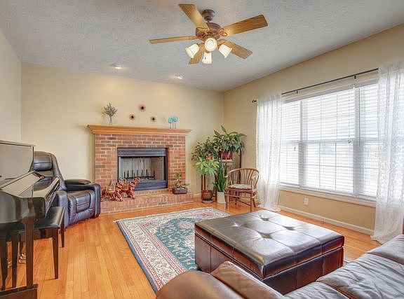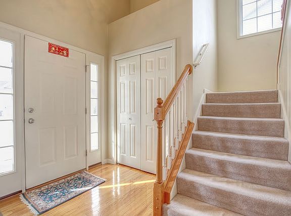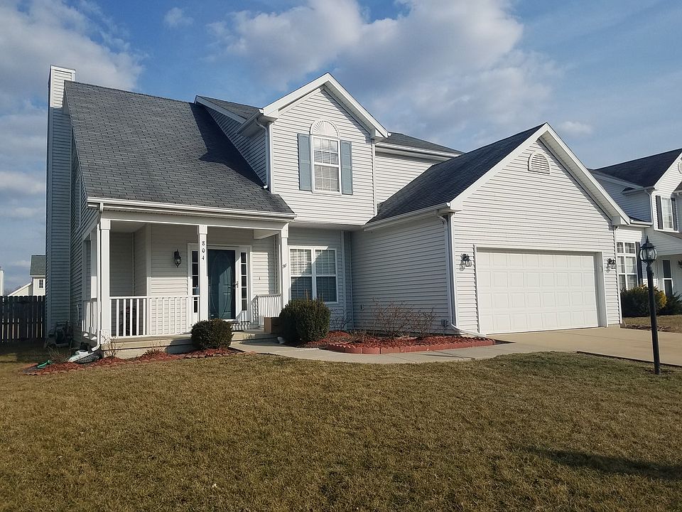 Great location in Prairiefields Subdivision. 2 story Entry welcomes you with natural light. Home is move in ready, with freshly painted walls and gleaming hardwood flooring on main level. Kitchen has island for seating and breakfast area for table. Also has front flex room that can be formal dining. Living room includes brick fireplace. Master bedroom is large with 2 walk in closets. Master bath has dual sinks and a jetted tub, plus separate shower. Basement is finished with possible 5th bedroom, family room, and office or exercise space. Plenty of options and also storage in this house. Backyard is fenced. Playset can stay. Price includes all current carpet to be replaced, and may be selected by buyer.