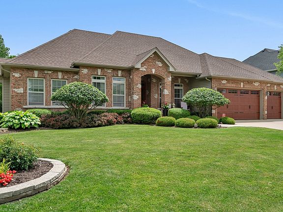 Prepare yourself to be "awestricken" by this impeccably maintained ranch in Blackberry Woods Subdivision. 9 Ft. ceilings and hardwood floors greet you once you enter. French doors accent not one, but two entrances to the den. Note the tray ceiling in the family room with brick faced fireplace framed by doors to the Three-Season Room. The hardwood floors continue as you make your way to the kitchen in this open floor plan. White shaker cabinets have above and below lighting with granite counters. An island breakfast bar allows for more counter space. Pantry cabinet, butlers pantry and breakfast room round off this kitchen. Bathing the interior with natural light is the three season room offering stunning views of the back yard. The disappearing windows never obscure the view and baseboard heat helps warm you in the early spring and fall months. 4' hallways and rounded corners take you to the bedrooms. The master suite has a deep tray ceiling. Its private bath, too, has a design ceiling and offers double sinks, jet tub, separate shower and linen closet. The massive walk-in closet has been professionally organized. Additional 2 bedrooms also have professionally organized closets and share a hall bathroom with walk in shower. You will become the gathering home of all your family and friends once they see this fully finished deep pour basement. The expansive recreation room seamlessly makes its way into a gaming area with bar. A half bath, work out room, and large storage area complete the lower level. The lavishly manicured landscape is stunning, and the backyard becomes breathtaking as the sun goes down with mood lighting. Rolling farm fields and wooded area are your views providing tranquility. The 3 car garage is heated, has epoxy flooring, a wall organized for tools, tool bench and newer garage doors. An additional shed holds the extras. The home is on a corner lot with a dead end street on one side and cul-de-sac on the other.