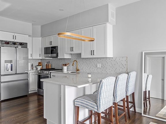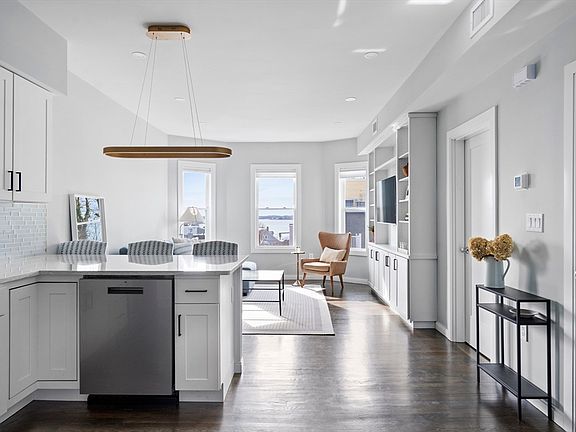 Discover a gem in City Point! This fully renovated penthouse condo at 804 E 6th offers stunning water views and is ready for you to move right in. With 2 bedrooms and a versatile flex room perfect for an office or nursery, this home meets all your needs. The kitchen features elegant white shaker cabinets, quartz countertops, designer lighting, stainless steel appliances, and a glass tile backsplash, all complemented by a breakfast bar that opens to a sunlit living area. Enjoy natural light streaming through bay windows with custom built-ins around the TV space. The en-suite primary bathroom includes double sinks and a spacious walk-in shower. Step out from the primary suite onto your private deck overlooking a beautifully landscaped, fenced yard. Garage parking is conveniently located next door. TWO private storage areas are included as well. Enjoy proximity to the beach, Castle Island, public transportation, and all the amenities South Boston has to offer.
