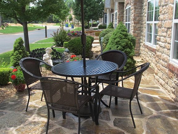 Lavishly upgraded Canterbury floorplan. Thousands spent. Superb location. Two bedrooms. Three living areas. Split bedroom plan. Actual real hardwood floors throughout. No carpet. Stainless appliance package includes refrigerator. Granite kitchen. Center island breakfast bar. Formal dining space. Coffee station. Three storage closets. Master bathroom ceiling is heated. Four Sun Tunnel Skylights - very light and bright. Vaulted ceilings. Open concept design. Plantation shutters cost $5,388. All windows tinted. Under counter and over cabinet lighting added. Missouri storm shelter in garage included cost $4,775. Beautiful landscaping and stone patio cost $3,299. It's absolutely gorgeous! This condo has all of the must have upgrades you would want for yourself!