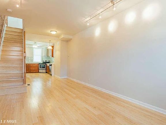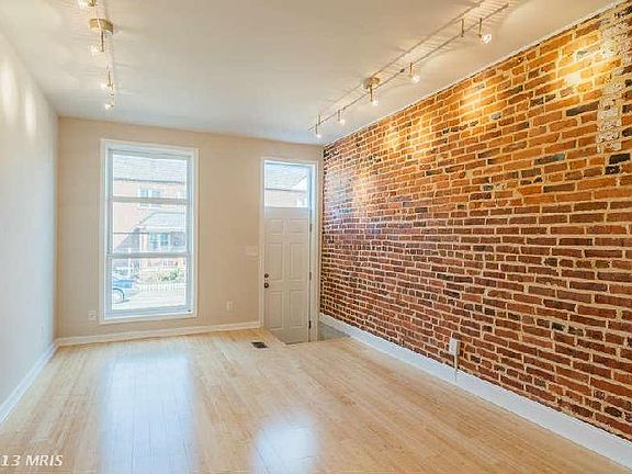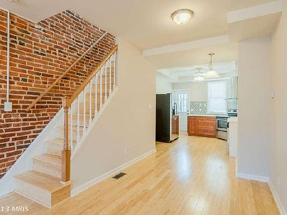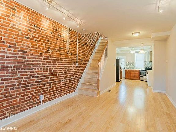 DESIGNER BREWERS HILL ROWHOME WITH OPEN FLOOR PLAN & PARKING PAD! Hardwood floors throughout, living room w/ exposed brick, kitchen w/ stainless steel appliances & tile back splash, Master suite with full bath, 2nd bedroom with hall bath, unfinished basement w/ laundry area, parking pad & convenient community parking.