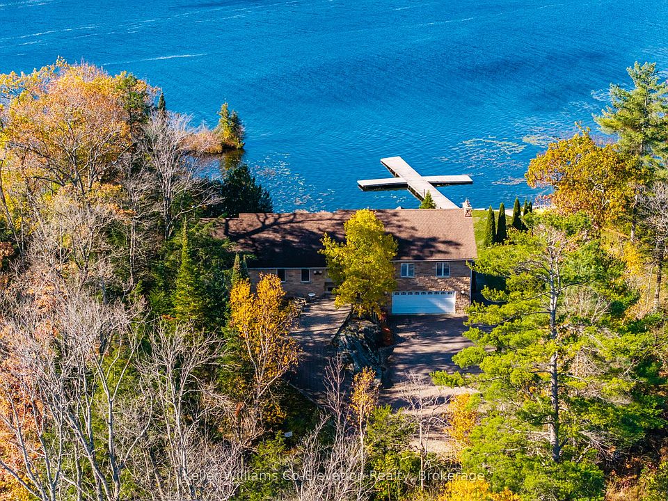 Live your dream on the coveted shores of Gloucester Pool. This rare property offers over 300 feet of pristine waterfront, blending the tranquility of cottage life with the sophistication of year-round luxury living. This four-bedroom, 4,100 sq. ft. residence is designed for both relaxation and entertaining. The open-concept living and dining area features vaulted ceilings, a majestic stone fireplace, and panoramic lake views that set an unforgettable scene. The chef-inspired kitchen boasts stone countertops, an island breakfast bar, and abundant cabinetry, perfectly balancing beauty and functionality. Down the hall, two guest suites open to the lakeside deck, while the primary suite offers an elegant ensuite, walk-in closet, and private walkout-ideal for enjoying morning coffee as the sun rises over the water. Throughout the home, solid wood doors, custom millwork, crown moldings, and marble countertops showcase fine craftsmanship and attention to detail. The walkout lower level expands the living space with a large family and entertainment area, fourth bedroom, additional bath, and convenient access to the garage and storage area. A sauna, wet bar, and wood-burning fireplace create the perfect retreat after a day on the lake or a cozy spot on a winter's evening. Outside, a mix of lush lawn and mature forest ensures peace and privacy. The expansive dock provides ample room for lounging or docking multiple boats, while a private boat launch offers effortless access to Gloucester Pool and the Trent-Severn Waterway-your gateway to endless boating adventures. This is a rare opportunity to own a timeless lakefront retreat where elegance meets natural beauty. Whether as a luxury cottage or year-round residence, this exquisite waterfront home invites you to live the lifestyle you've always imagined.