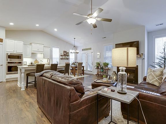 Beautiful ranch home in South Lakes with 3 bedrooms 2 baths and no steps getting into the home. Shows like a model with 1 home owner, who only stays 6 months out of the year. Kitchen has huge center island, lots of cabinet space, quartz counter tops and Stainless Steel Appliances. Family Room has a vaulted ceiling, gas fireplace and overlooks private wooded backyard. Primary Bedroom has tray ceiling, hardwood floors & ceiling fan. Bath has dual vanities with lots of storage, tile shower with seat and spacious walk in closet. 2 bedrooms towards front of home with bath in between. Relaxing screened in porch with patio overlooking wooded backyard. Lake is on the other side of the trees. Pool, clubhouse, play area and lakes to enjoy in the community! A MUST SEE!!!