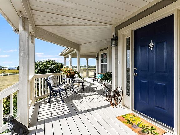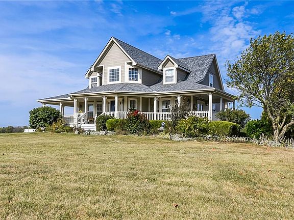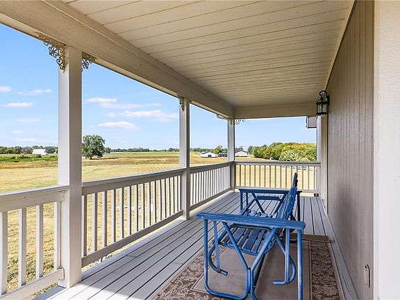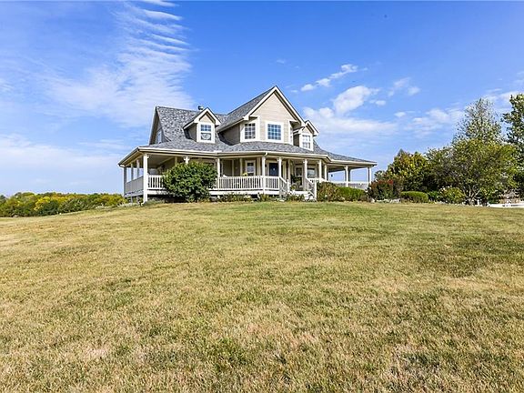 Beautiful 1.5 story house on 3 acres with 3 bedrooms and 2 full plus 2 half baths. Enjoy the Wrap- Around 3 sides Porch and the Deck in the back morning and evening. Come inside to the soaring Ceiling (17 feet high!) in the Entry and Great Room with Walls of Windows for Natural Light. Wood Burning Fireplace in the Great Room. Gleaming hardwood floors in the Entry, Dining Room and Kitchen. Primary Bedroom on main floor with Ensuite Bath and Walk-In Closet. Carpet Allowance a consideration. Formal Dining Room and a Breakfast Nook in the Kitchen. Washer/Dryer and half bath on the main level. Upstairs are 2 Bedrooms with nice Gable areas and a full Bath. Lower Level has a Walk-Out in the unfinished space - ready for your design, a half bath that is stubbed for shower and a Safe Room in addition to the 2 car garage. The Roof is new in July, new HVAC Heat Pump in 2020 and attractive Granite Countertops and Back Splash installed in 2014. White Vinyl Fence on 3 sides of property. Located in Western Johnson County with much lower taxes. Easy access to F Highway and US 50. Come enjoy the Good Life in a planned subdivision of Acreage Homesites.
