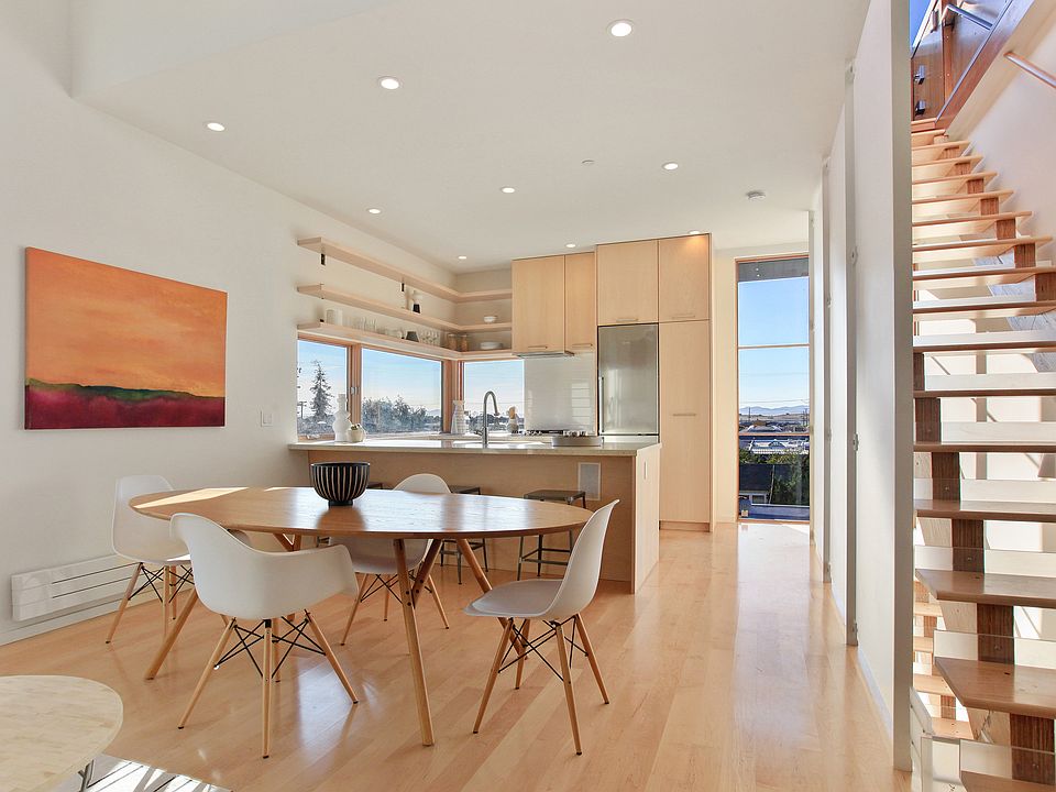 Once again the prolific and architect, designer, and builder, Matthew Wadlund, has created thoughtful, environmentally conscious townhouses with Berkeley sensibilities around a European-style courtyard. These new "site condos" are designed for simple, less-cluttered living, and following Wadlund's standard of excellence. All are built to LEED platinum specifications. This unit is a generous 1,500 sq.ft. and has a 180-200 sq.ft. roof deck with a 360° panoramic view, perfect for outdoor entertaining. All homes have three stories, but they are each unique in their layout. Each includes a private rooftop patio, 3 bedrooms, (including a 'flexi room' which can easily be used as an office) and 2 baths. The main living floor, with an open kitchen, dining and living space, features 13' ceilings and a ceiling fan. It is from there that a staircase leads through a retractable skylight to the panoramic view deck. The kitchen features Bosch Energy Star certified appliances, recycled glass countertops and European-style cabinetry. There are maple hardwood floors throughout. Parking is convenient - three townhouses have carports and one has its own off-street parking spot accessed from the Page Street alley. Located in "Berkeley's Design Loop", and with a Walk Score® of 80 and a Bike Score(tm) of 98, homeowners have access to everything without use of a car. Freeway and public transportation access is within minutes. *All measurements approximate, per builder