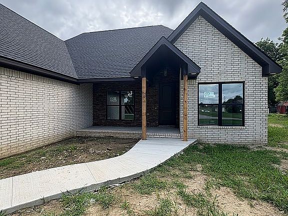 Modern brick and rockCustom tile showerBeautiful curb appealGranite countertopsLarge covered back porch