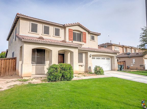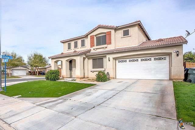 This traditional two-story home is located in Brawley's Malan Park neighborhood. Offering 4 bedrooms, loft upstairs, and 3 bathrooms all at 2,910 square feet. The home's floor plan offers a formal living at the entryway with a separate formal dining room. At the back of the downstairs there is a large open family room, kitchen with bar top island, and a breakfast area that leads to the backyard. Downstairs also offers a large bedroom and full bathroom. The corner lot offers a large backyard space and the full-length stucco back patio is the perfect oasis for spring evenings. Upstairs is a large loft, 3 bedrooms and 2 bathrooms.