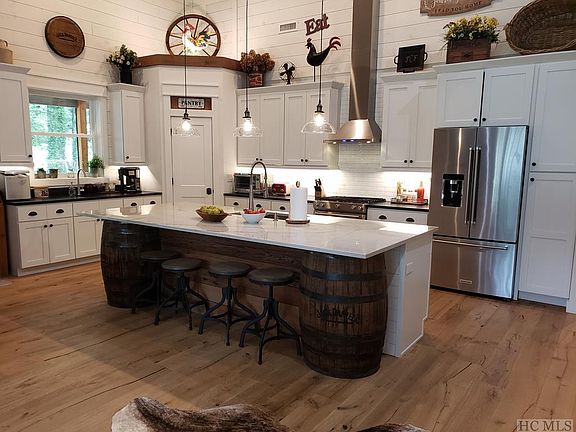 Located in the Blue Ridge Mountains at a cool elevation and sitting on a 1.56 acre meadow in the heart of Cashiers. This recently constructed (2018) modern farmhouse is all one level living and level entry. Open concept, with a chef's kitchen opening to a 12x36 covered screen porch and a 12x12 grilling deck, perfect for entertaining. Wide plank wood flooring throughout, shiplap walls with vaulted ceilings in kitchen, dining and great room. Spacious master suite opening to screen porch, walk in shower, water closet, and walk in closet with built-ins. Two bright and airy guest bedrooms with vaulted ceilings. The lower level has over 2000 square feet finished for a retail business or office space, perfect for those wanting to live and work in the mountains. For the car enthusiast, the lower climate-controlled space would be perfect. This level also has 2 French doors opening to another 12x36 covered front deck. There is also a detached 50x16 garage. Ideal for car storage, workshop, or retail inventory storage. Plenty of parking areas and turn around for large delivery trucks. Beautiful landscaping and views. Six bedroom septic installed and additional well hookup available. Custom home builders own home. Chandeliers on front porch are excluded.