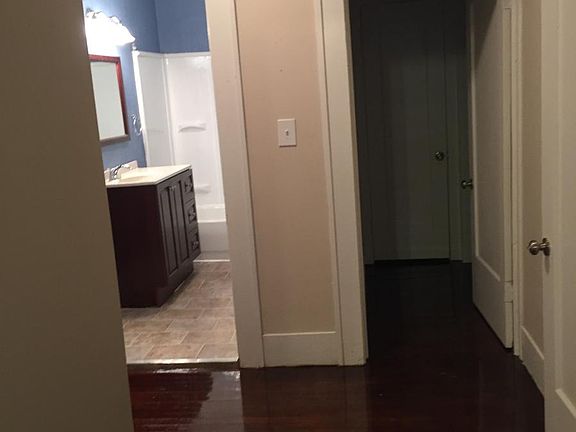 Completely remodeled interior with fresh re-finished hardwood floors. Large living room with a fireplace.