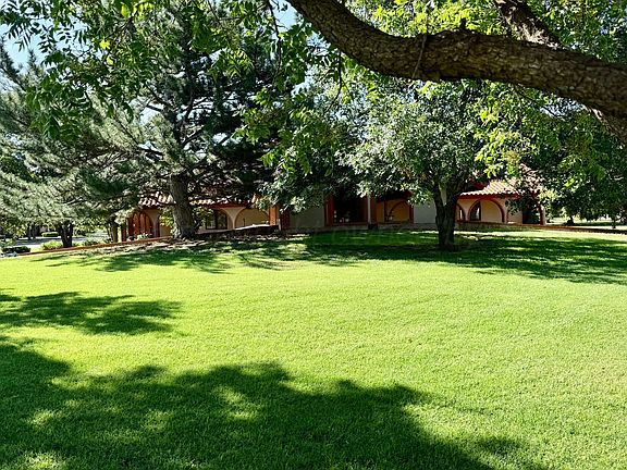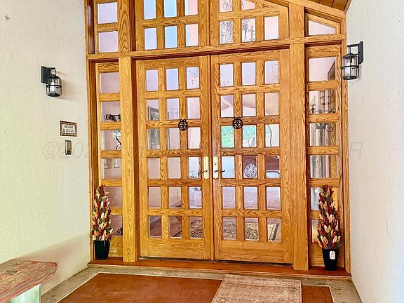 NOW WITH NEW PRICE this custom build from 1986 has amenities that must be seen to be appreciated. The living area floors are hand cut mesquite milled just for the home. The grand dining table is made from the same to fit the dining room. You enter the home through a magnificent set of doors into a sweeping entry way with tall ceilings, chandeliers and natural light. The main bedroom has the same tall ceiling and oversized spaces. There are floor to ceiling windows and doors to the outside, fireplace and hearth that fill one wall and built in storage. The safe closet and cedar closet are in the main room. Bath, sink area and room-sized closet are just behind. The next set of rooms encompass a steam shower, sauna and relax/workout areal. The next rooms are the kitchen and dining. Kitchen is ringed with counter tops and cabinets. The bar area holds the stove top and counters on one side and full bar for eating or gathering on the other side. The room is finished off with a breakfast room ringed with the floor to wall window to the outside green view. The amazing dining room area is next door and is truly one of a kind. The mesquite floors continue there, two banks of built in storage and shelving grace the walls. The custom made mesquite dining room is lit by two chandeliers and surrounded by eight upholstered chairs. The living rooms reminds of a ballroom with the high vaulted wood planked ceilings and the immense space. The fireplace wall with custom mantle and cabinetry grace an entire wall and one wall is full with tall bookcases with industrial shelving. The same floor to wall windows and doors finish the walls on three sides. Large bar area is in the corner of the room near the kitchen. There are two bedrooms, each with unique features and large closets, that share a jack and jill bathroom. The next room was designed as an office with original built-in desk, return and custom storage and shelving. The path to the four car garage holds an immense pantry area with extended shelving and drawers. It is also built with arched window walls that again take you to the beautiful outside green space that wraps around the home. The garage is equipped with four electric doors and space for other storage or freezers, etc. A large basement is accessed through the garage. The home is absolutely surrounded by grass, trees and dense perennial plantings. The yards are sustained by a full sprinkler system. There is so much more to be experienced - call for your personal tour today!
