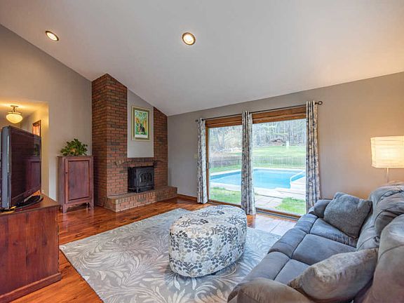 Spacious, well-maintained Raised Ranch on .86-acre lot, away from it all and close to everything! There is so much to love about this lovely home the moment you step inside - from the hardwood floors & cathedral ceilings to the easy room flow, open floor plan, indoor/outdoor entertaining spaces & abundant natural light throughout. You'll love the custom brick fireplace & hearth in the living room w/direct access to the inground pool area. Nice big kitchen w/lots of counter & cabinet space, open to dining area & access to elevated deck/patio overlooking side yard. Finished space in basement including room used as bedroom & 1/2 bath w/laundry is a bonus. 2-car under garage & detached oversized 1-car garage offer plenty of room for vehicles & toy storage. On almost an acre, you'll enjoy a spacious front yard, pool area & ample room in the backyard beyond the pool - great for entertaining, gardening, pets, firepits & more. All this in a quiet, suburban setting, just minutes from all intown amenities & the turnpike. No showings until Friday, April 30. Offers accepted through Monday, May 3 at noon.