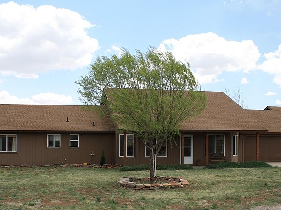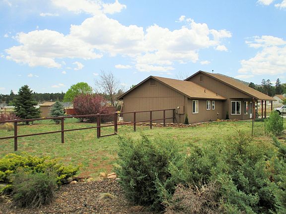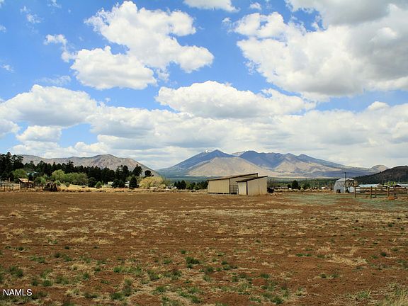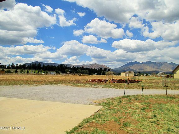 This fabulous ranch style home offers an open floor plan with vaulted ceilings, million dollar views of the San Francisco Peaks, wood laminate flooring and a pellet stove. The modern kitchen offers two tone cabinets, quartz coutertops, upgraded stainless steel appliances, gorgeous tile and a custom wood eat-in bar. The master bedroom has a renovated en-suite bathroom, 4 closets and an adjoining office space. This split floorplan has 3 more bedrooms and a large bathroom. Out back enjoy an oversized walled-in patio with custom metal gates and propane firepit. Beyond the patio, this 2.6 acres offers a nicely fenced in area of aprx. an acre, with a chicken coop, greenhouse, shed, and many different types of trees including an apple tree and raspberry bushes. The front yard has (click more)