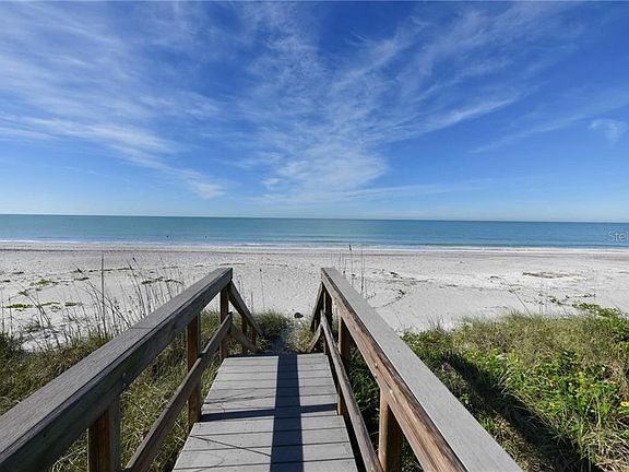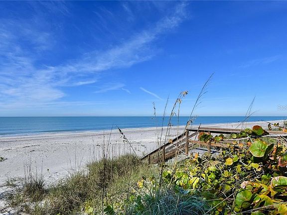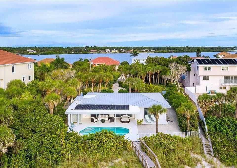One hundred feet Right on the beach on Manasota Key, this home has been updated to include a touch of its original vibe and modern Euro-styling. It's on a gated half-acre, with fencing and plenty of parking for guests. It's ready to move in, not needing a lick of work. A short walkway over the dune gets you to the beach - a 15- to 20 second walk at most. For fun, you can dip yourself into the pool, run across the sand into the Gulf, and continue that all day until you collapse onto the lounge seating on the 37-foot-wide terrace. The pool has a new salt system, new solar heating, and pool auto-fill and overflow. And there's a large open-air Bisazza shower to get the salt and sand off before heading indoors. Privacy is one of the best attributes of this backyard; tall palm trees and lush vegetation allow you to sunbathe as nature intended, if you so wish. Prepare for sunsets right off your beach. They are spectacular. The wall of new sliding glass doors brings in lots of natural light and fresh air, but thanks to the deep overhang, the house can stay cool. The kitchen's custom marble countertops and a waterfall island create a contemporary family gathering bar, complete with Schott cooktop. All-new flooring runs throughout the house. Two master bedrooms, one on each end of the house. Each has a Bisazza-tiled bathroom and Grohe fixtures.