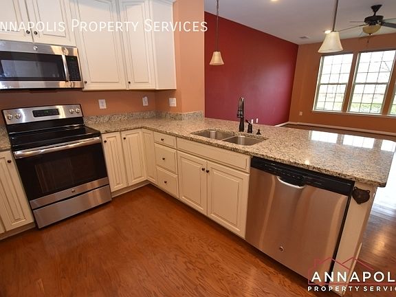 Immaculate three-bedroom, three-bathroom (2-full + 1-half), two-level townhouse condo with an attached garage in the Orchard Square community of Odenton. Large open-plan living area, dining and a beautiful kitchen with granite counters, and stainless steel appliances on the main level. Three spacious bedrooms and two full bathrooms upstairs, including a large primary suite with two walk-in closets, a primary bathroom with two vanity sinks, and a laundry area with a washer and dryer. Attached is a single-car garage and parking pad included. Located off Route 3 and minutes away from major shopping areas, dining, and Waugh Town Center. Close to Ft. Meade, BWI Airport, and 25 minutes to Baltimore. Water usage included. Pet Information Cat : Yes Dog : Yes