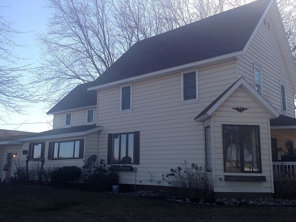 Large 2 story, farm house style. Nice front porch, upstairs completely renovated with new windows. Main floor has new finishes. New within the last 10 years, furnace, pellet stove, well, lower roof sections, laundry/main floor bathroom, backyard fenced with 5' chain link, upstairs completely renovated, garage doors and openers, numerous other improvements. Large back yard with mature trees that shade the house in the summer.