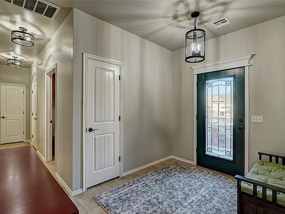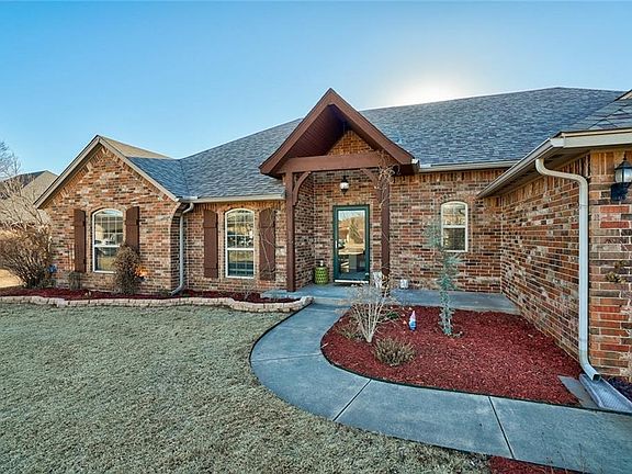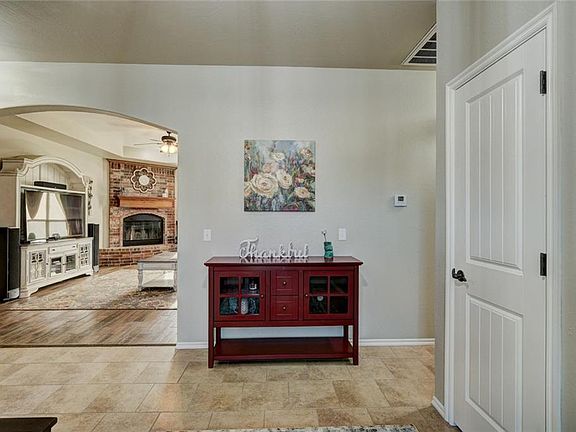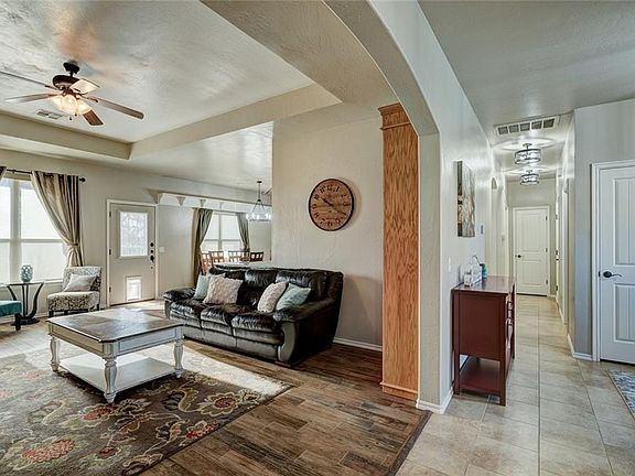 Charming Home on aprox 1/2 of an acre in the popular Highland Trails. Move in ready home has many nice features and updates including new interior paint, new plumbing fixtures, new HVAC, new water heater and updated light fixtures. Home has wood look tile in the living room and hall and a split floor plan with primary on the opposite side of secondary beds. This flexible floor plan can be 3 beds and an office or a 4th bedroom. The Kitchen is inviting with a brick wall feature, updated backsplash, breakfast bar, painted cabinets including a roomy pantry. The primary suite is large with a spa bath whirlpool tub, double vanities, toilet closet and a walk in shower. The roof is 4 years old and has impact resistant shingles. The back yard has a dog run and fruit trees to enjoy. Storm shelter in the new epoxy garage floor. The water softener stays with the home.This close knit community boasts a community pool, clubhouse, playground, stocked pond, baseball field and a volleyball court.