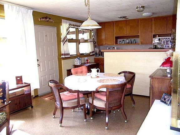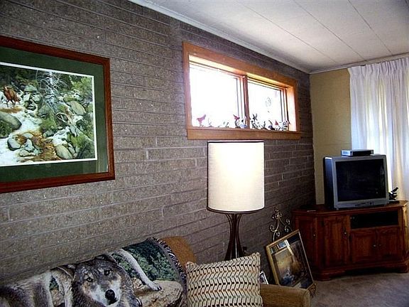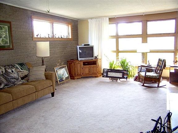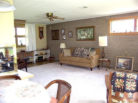 The unique design of this open concept home has split rock exterior and is very well built. The new carpet was just installed. Large windows bring in lots of light. 3 bedrooms, 1 1/2 baths, galley kitchen, large living room with many windows overlooking the spacious back yard. Dinette area is open to the liv. rm. Kit.w/appls. The corner fireplace is beautiful! Enclosed porch in back is just wonderful to view the very spacious lot with birds, and sometimes deer! Very tranquil. Large basement with block windows for lots of storage. Att.gar.has service door in rear, but no access to home. This is the original owner! Solar panels on home heat comes in from vent on upper wall. Gas Fur, hot wtr htr, humidifier newer. a/c 2005, thermopane windows 10 yrs, fexacore flrs.in home. Exhaust fan in kit. Interior walls are split rock & exposed mansonry. Come and take a look at this home. No flood insurance required.