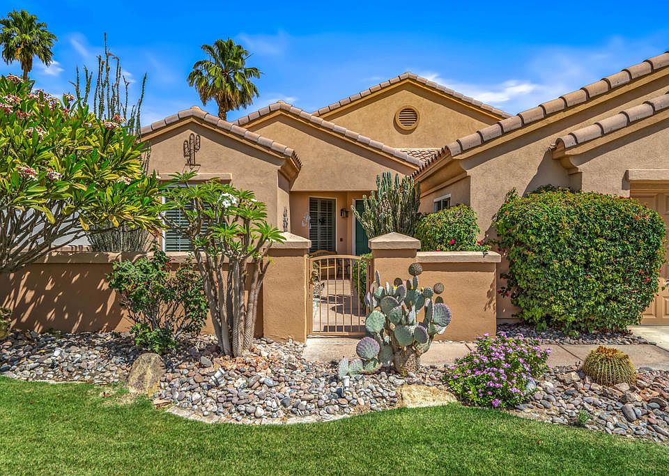 Beautiful great room plan in Heritage Palms C.C. Located across the street from the clubhouse, this OPEN design 2 BD, 2 BA PLUS DEN home has never been on the market since these original owners had it designed and built. Featuring slab granite kitchen counters, breakfast nook bay window, custom soft closure cabinetry, DBL wall ovens, built-in closet with storage cabinets in laundry room and plantation shutters. The spacious primary suite has the optional bay window, walk-in closet, dual sinks and a custom designed vanity where the tub has been removed. Additional upgrades include a LARGE 25' x 25' air conditioned garage with sink, slate stone entry courtyard, both A/C units, the water heater and furnace have also all been replaced. This home also has a nice large covered rear patio for entertaining or to simply relax and enjoy the beautiful golf course, mountain views and desert lifestyle. All of these features combined with a convenient short stroll to the clubhouse makes this a unique opportunity in Heritage Palms. Located on the border of Indio and La La Quinta, this premier 55+ adult community features an 18 hole championship golf course, pickleball & tennis courts, indoor & outdoor pools, fitness center, grill room, card rooms, billiards room, social clubs and more.