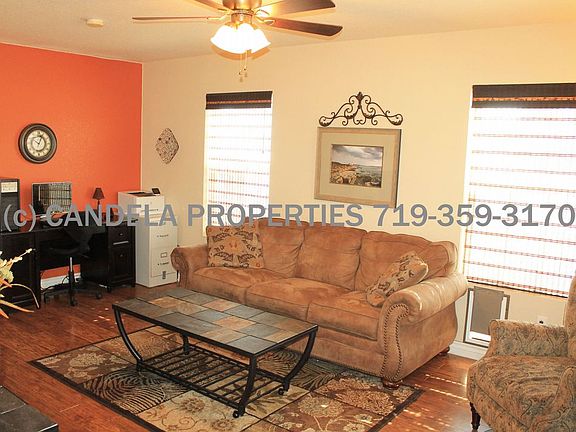 COMING AVAILABLE AUGUST 1, 2016, is a newer FOUR BEDROOM, 2.5 BATHROOM home in the CUMBERLAND GREEN subdivision of FOUNTAIN, COLORADO. Built in 2006, this TWO-STORY home features CENTRAL AIR CONDITIONING, a SPACIOUS MASTER SUITE (bedroom and private bathroom with dual vanities, garden tub/shower combo), all four bedrooms on the second floor, a beautiful eat-in kitchen with UPGRADED APPLIANCES (gas stove, built-in microwave, side-by-side refrigerator with water/ice maker, dishwasher), pantry and canned lighting, a CUSTOM-FINISHED two-car garage with Gladiator Cabinets and a fully-fenced back yard with separate dog run. Situated in the Cumberland Green subdivision, this 1,901 square foot home is located within 1/2 block of School District 8's (Fountain Fort Carson) Eagleside Elementary School and the Cumberland Green park and DISC GOLF COURSE. It's also mere minutes by car from FORT CARSON, INTERSTATE 25, the popular Metcalf Regional Park and the rapidly-expanding Mesa Ridge Parkway shopping corridor (Safeway, Lowe's Chick-fil-A, Culvers and Starbucks). Other features of this home include a main-level powder bath, laundry room, stamped concrete patio, xeriscaped back yard, automatic sprinkler system and tons of storage space - including a separate storage shed in the back yard. Room Sizes Living Room 11 x 18 Kitchen 12 x 13 Dining Area 13 x 11 Master Bedroom 16 x 14 Bedroom #2 11 x 16 Bedroom #3 12 x 11 Bedroom #4 10 x 11 The layout of this home is as follows: The main level consists of the formal living room, country-style kitchen with attached eating area, laundry room, powder bathroom and access to the two-car garage and fully-fenced back yard. The second story features the master suite, three additional bedrooms and the third bathroom. PET POLICY: WE ALLOW A MAXIMUM OF TWO (2) PETS PER PROPERTY AS LONG AS THEY ARE NOT ATTACK-TRAINED DOGS OR HAVE A HISTORY OF BITING PEOPLE OR DESTROYING PROPERTY. WE DO NOT COLLECT A DEPOSIT. INSTEAD, WE CHARGE MONTHLY PET RENT OF $25 PER PET - again max of two. CANDELA PROPERTIES HAS A STRICT NO SMOKING/NO MARIJUANA POLICY MOVE-IN FUNDS: We require an amount equal to twice the first month's rent ($1,450 x 2 or $2,900) in certified funds to move in, regardless of when in the month it occurs. We then pro-rate the second month's rent to reflect when the contract was signed in month #1. AVAILABLE FOR $1,450 DISCOUNTED MONTHLY RENT For additional information - or to schedule a showing of this property - feel free to contact Kurt Eilmes with Candela Properties at 719-359-3170. www.CandelaProperties.com