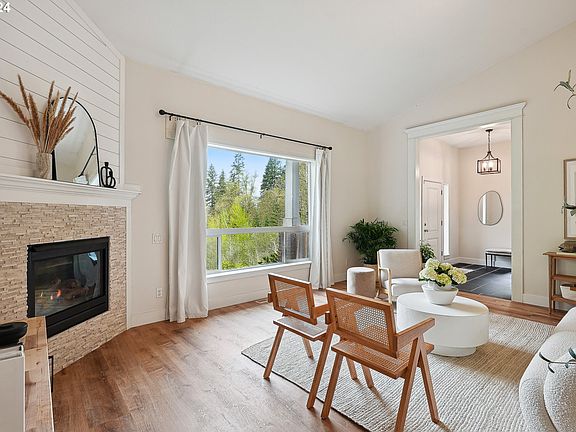 Before you step foot in this beautifully remodeled home, take a look around the covered front porch to appreciate the landscaping, forest across the street, and trees on two other sides of the house! Once inside, the gas fireplace, tall ceilings and modern light fixtures combine with ample natural light to make a stunning living, dining and kitchen area. The living room, primary bedroom, and kitchen were all remodeled recently featuring luxury vinyl plank flooring and quartz countertops and brand new appliances in the kitchen. Primary bedroom has an electric fireplace, porch, and attached bathroom. A second porch/deck leads you from the dining room to the backyard, which is surrounded by trees and features a small creek just past the property line. A fully finished daylight basement is accessible both from the main floor and from the backyard, featuring a full bathroom and two bedrooms. The 3-space garage has tons of space for your car, storage, or workshop needs and sits at the end of the large driveway with room for two more cars. [Home Energy Score = 6. HES Report at https://rpt.greenbuildingregistry.com/hes/OR10008859]