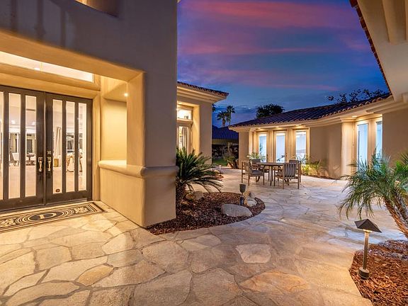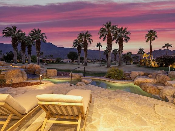 This expansive 3,941 sq ft home is nestled within the coveted community of PGA West, and offers a rare opportunity to experience the very best of desert living with a premium golf course view, boasting beautifully landscaped grounds and custom boulder enhanced pool and spa. Facing west, the home captures breathtaking mountain, fairway, and sunset vistas that seamlessly flow indoors, creating a harmonious blend of luxury and nature.This home has undergone a complete contemporary transformation, showcasing an array of high-end upgrades and meticulous attention to detail. The interior boasts all-new can lighting, brand-new flooring, and fresh interior paint throughout, with new baseboards adding an extra touch of elegance. The living room features a dramatic new electric fireplace and French doors leading to the courtyard entertainment area, The kitchen is a chef's dream, completely remodeled with stunning marble countertops, custom white oak cabinetry, and top-of-the-line Monogram appliances. New flooring, faucets, lighting, door hardware, a dramatically faced stove vent complete the space, while a large island and full backsplash elevate the overall aesthetic. Furnished per inventory.