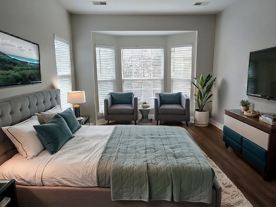 **PRIMARY BEDROOM is spacious and has a large bay window for natural light. It also has a large walk-in closet.