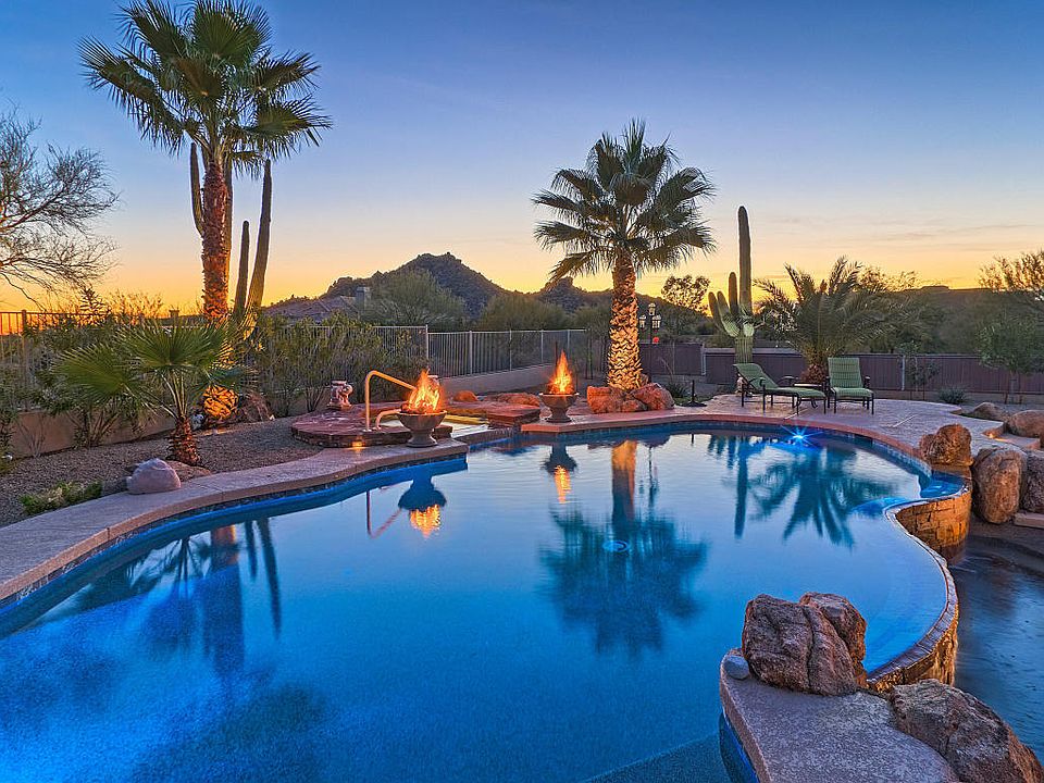 Fabulous single level 3BR home, plus guest casita & office. Rear yard faces South and backs onto a serene desert open space & mountain views. The home is perfect for year round living and entertaining seasonal guests. Step into the large Great Room and you're greeted by a view of the backyard oasis, featuring tropical landscaping, boulder stacked pebble tec pool and spa with in-floor cleaning system. The split floor plan provides privacy for occupants and guests. Master Suite contains a sitting area, his & her walk in closets, dual vanities, jetted tub and walk in shower. You'll enjoy the gourmet kitchen with Granite tops and island, alder cabinetry stainless steel appliances, and wine fridge. The home contains 4 HVAC units for personal temperature control and has a courtyard entry. Owner/agent.