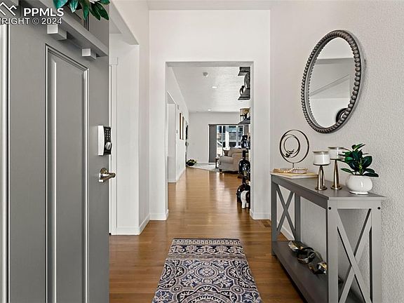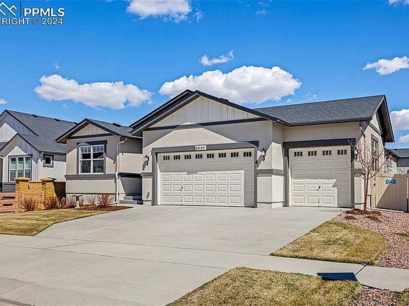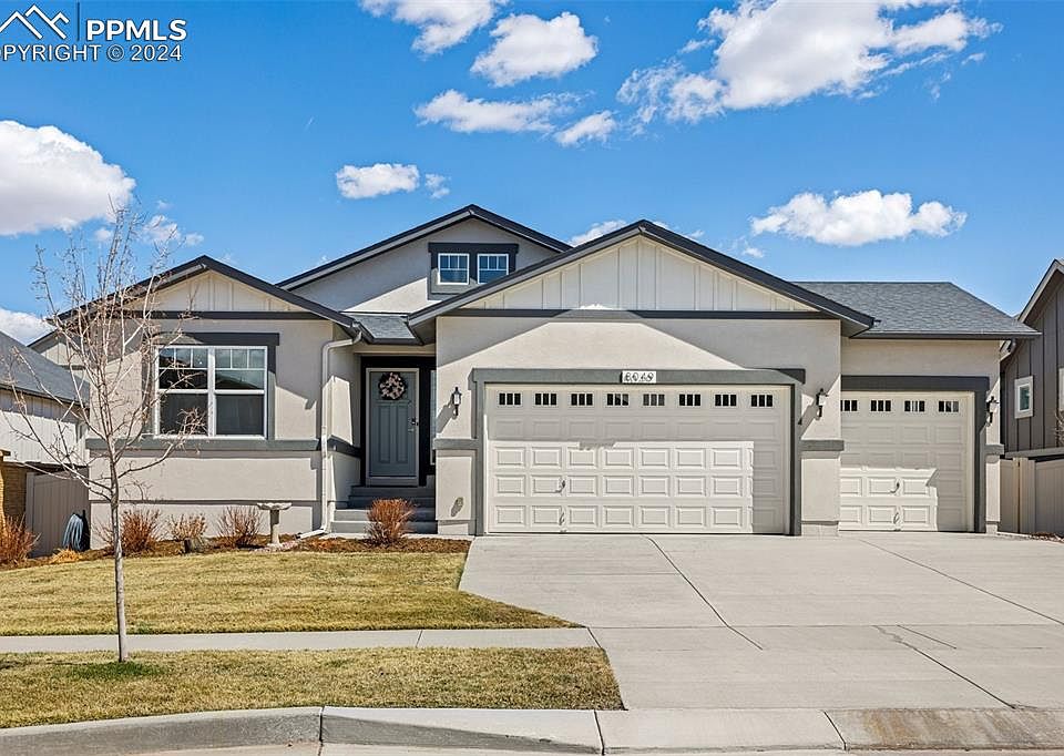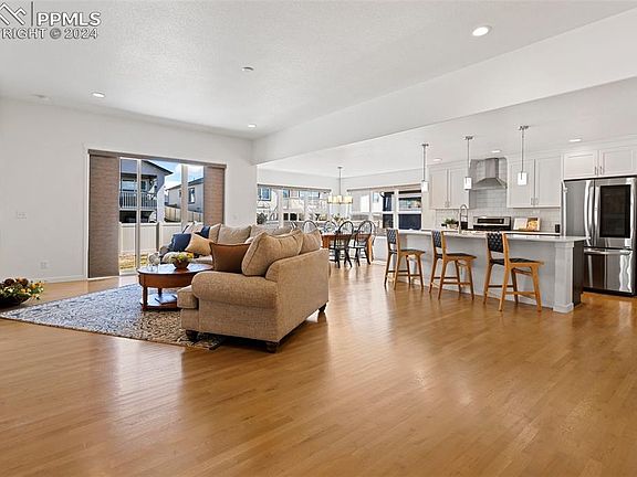 Welcome to this exquisite ranch-style home nestled in the most desirable area of NE Colorado Springs and within the Academy District 20 school district. This home boasts energy efficiency, mountain views, and upgrades that elevate single-level living to new heights. The exterior features a larger driveway, an oversized 3-car garage with custom epoxy-finished floors, and built-in storage racks. The interior offers a spacious open-concept layout with high ceilings, an abundance of natural light, custom hardwood floors, and a stone-surround gas fireplace. The kitchen is a chef's delight, featuring an extended island with seating, top-of-the-line appliances, a custom backsplash, upgraded cabinetry, quartz countertops, a gas range double oven with one oven being a convection option, a stainless steel hood range, a French door refrigerator, a built-in microwave, and pantry space. The main level primary bedroom suite includes a connected luxurious five-piece bathroom. The primary bathroom features a double vanity, deep soaking tub, separate shower, and a walk-in closet. There is also a second bedroom with mountain views, another full bathroom, a flex room, and a laundry room on the main level. The finished basement offers a large rec space equipped with roughed-in plumbing for a future wet bar and surround sound pre-wiring. Two additional bedrooms, a third full bathroom, storage closets, and an additional flex space that can be finished into a 5th bedroom or home gym complete the lower level. Access to the outside of the home is directly off the main level. The patio overlooks a beautifully landscaped backyard, features vinyl privacy fencing, and is perfect for outdoor dining and activities. Completed landscaping and fencing, custom blinds, and A/C make this home the perfect blend of comfort, style, and functionality. Zoned for D20 schools and also near walking paths, parks, and local amenities, don't miss the chance to make this your dream home!