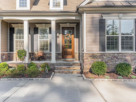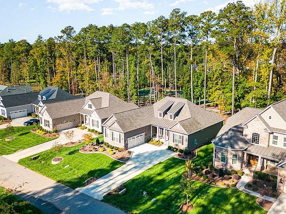 This one-level remarkable home, a mere 3 years young, appeals to discerning buyers seeking excellence. Nestled along the scenic Hasentree golf course, it exudes charm and sophistication. The kitchen is a masterpiece: featuring custom cabinets, a sprawling 12-foot leathered granite island, top-tier appliances, and a wine refrigerator - making it ideal for both culinary artistry and entertaining. The interior showcases pristine hardwood floors, a commanding 10-foot stone fireplace, and thoughtfully curated designer lighting. The master bathroom boasts upgraded tile, while the closet is elegantly custom-designed. Boasting an oversized 2 garage with new epoxy coated floor. An irrigation system ensures lush lawns, while a large back porch and stone patio offer serene panoramic view of the 4th fairway. The fully floored attic space provides generous storage capacity, a practical touch. The Hasentree community offers an array of amenities: a club with a pool, sport courts, walking trails, fitness facilities, a dining room, a bar, and an outstanding golf club.