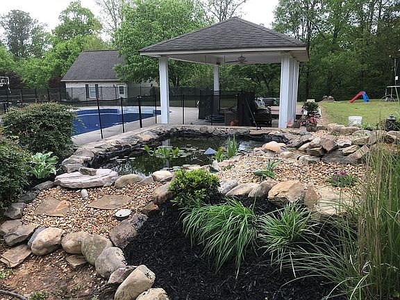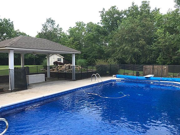 Beautiful brick two story home nestled on hilltop in middle of almost 6 acres. Master suite located downstairs. Three bedrooms and two baths upstairs. Spacious rooms with home office, dining room, and foyer opening to living room with vaulted ceiling. Large fenced back yard which can be enjoyed on covered back deck. Enjoy views of mature trees, in-ground pool, gazebo, and koi pond with waterfall feature. Two stall attached garage and matching brick two stall detached garage with 2nd floor storage and storm shelter.