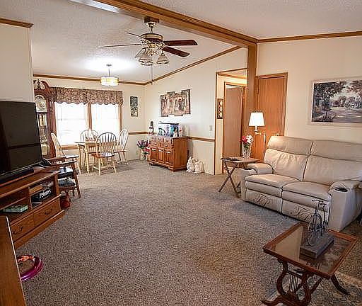 Don’t miss your chance for stress free living in beautiful River Park. Walk Into this spacious 3 bedroom 2 full bath that has an open concept - large living room and updated kitchen (appliances included). This home also features: newer roof-windows-furnace-central air-carpet-updated bathrooms-and fresh paint. The 14 x 12 master bedroom has a walk in closet and an easy accessibility shower. If your 55 and older and ready for a carefree living contact me today for your private showing today! (For just $320 per month lot rental includes city water, sewer, garbage & lawn care.)
