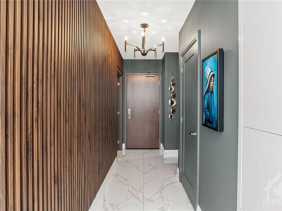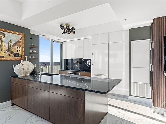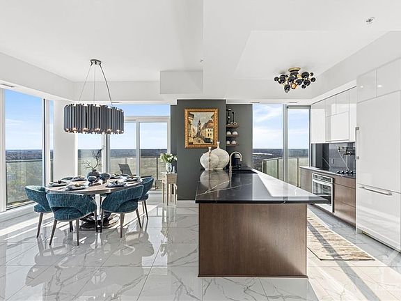 This 40th floor penthouse defines the pinnacles of luxury living. Offering over $350K in carefully curated upgrades, this unit is a masterpiece of bespoke design w/ no expense spared. Upon entering, you're greeted by an open-concept layout showcasing unrivalled views of Ottawa w/ floor to ceiling windows bathing the living space in natural light. A symphony of sophistication, the main living area ft. fluted wall panels & ceilings adorned w/ exquisite Brubeck chandeliers imported from Portugal illuminating the oversized tiled flooring. Custom gourmet kitchen w/ quartz counters, custom cabinets, built-in cooktop, oversize fridge & generous island. Grand dining area seamlessly transitions into cozy living space w/ electric fireplace. Bathrooms complete w/ floor-to-ceiling marble like tiles, while the executive office boasts custom millwork & its own elegant chandelier. A sanctuary of luxury, primary suite ft. custom-closet & spa ensuite w/ glass shower. 24hr Irrevocable on all offers.