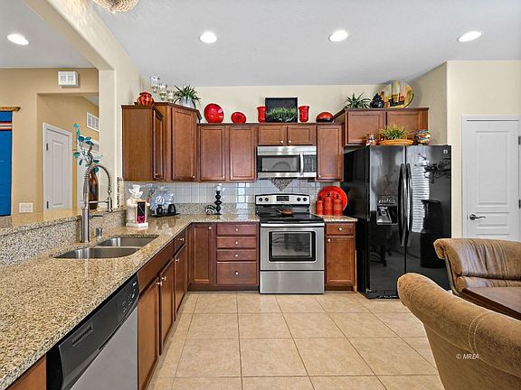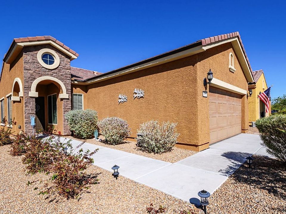 Pristine home looks new ! Beautifully Upgraded 2 Bedroom Daisy Model in Sun City Mesquite. Open concept floor plan with Tile flooring throughout all main living areas, nice carpet in bedrooms. Kitchen is large, with room for dining and features a flush mount acrylic chandelier fixture over sink, 3 cm granite counter tops, custom tile backsplash and includes refrigerator, range, water softener. Bay window in master bedroom adds extra light and space. upgraded ceiling fan and its own master bathroom with walk- in shower. Guest bedroom and bath are opposite end of home from Master Bedroom - nice for privacy when you have company. Great room has custom painted accent walls and a gorgeous ceiling fan with acrylic chandelier light. Completely Fenced to keep pets in or out. Super nice backyard with extended pavers and shady patio cover, plus a privacy wall on the side of the patio. All low maintenance front and back yard with desert trees and flowering bushes. Sun City Mesquite has a great Rec Center with indoor and outdoor pools, 18-hole putting green, tennis, pickleball, bocce, walking trails and more - for residents only. And a huge discount on golf at the Conestoga Golf Club.