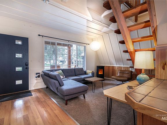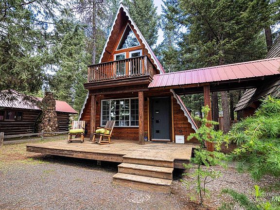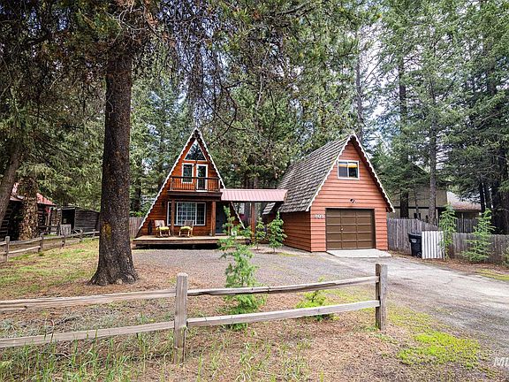 Adorable A-frame home in McCall is conveniently located by Ponderosa Park, Golf Course and Payette Lake, offering a cozy and remodeled living space and full kitchen, laundry and large one bedroom. Spacious outside living with room for table, chairs and fire pit, and fenced back yard. Main house is 630 square feet and detached one car garage plus extra storage and an additional bedroom above garage for another 230 square feet. This home is ready to enjoy!