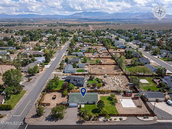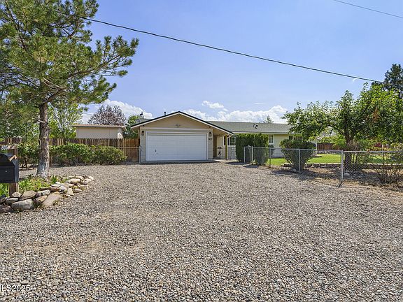 Transform this corner-lot property of 0.56 acres with its chicken coop, fruit trees, raised garden bed, storage sheds, RV parking, oversized fenced yard, and more, and its 1557-square-foot ranch-style house with its 3 bedrooms, 2 bathrooms, 2-car garage, and central air conditioning and forced air furnace (both installed 2019) and more into a mini ranch in Gardnerville Ranchos. This inviting home, built in 1969, blends comfort, functionality, and charm with an open-concept layout designed for modern living. The heart of the home features a spacious kitchen with hickory-faced cabinets and drawers, granite countertops, ceramic tile backsplash, and heated floors, seamlessly flowing into the dining area and family room. A vaulted ceiling with a wood beam apex, pellet stove, and evaporative cooler enhance the family room, while a separate living room offers additional space for relaxation. The primary suite includes a bedroom with cove ceiling, ceiling fan, reach-in closet, and mountain views, plus an ensuite bath with dual sinks, medicine cabinet, electric baseboard heating, and a shower/tub combination. Two guest bedrooms, each with ceiling fans and reach-in closets, share a guest bathroom that boasts a jetted tub/shower combo and electric wall heater. Outdoors, enjoy a lifestyle of self-sufficiency and recreation with a chicken coop, fruit trees, raised garden bed, storage sheds, RV parking, concrete pad with basketball hoop, and an oversized fenced yard—all framed by scenic mountain views. With no CC&Rs and no HOA, this property provides freedom and flexibility to make it your own. Submit your best offer now and name this mini ranch before someone else brands it their own.