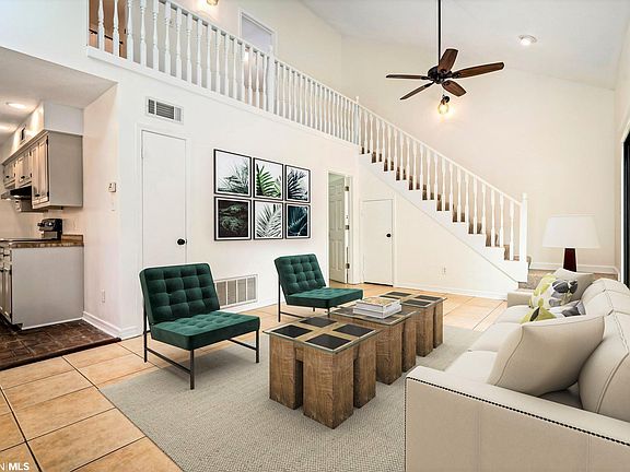 Conveniently located in popular Pinehurst, close to Providence Hospital, Restaurants, Shopping and the University of South Alabama, this story and a half, contemporary style home has soaring ceilings, fresh paint and new carpet. The eat in kitchen has painted cabinets and split brick floors. The living room area features a large stone fireplace and walks out to a side patio. The downstairs master has a walk in closet and it's own en-suite bath with a double vanity. Upstairs you'll find 2 more bedrooms and a nicely updated full bath. Outside, in the back yard, there's a patio area with decorative string lighting. ***Note: Living and Master Bedroom Pictures have been virtually staged. **(ANY/ALL UPDATES ARE PER SELLER). *LISTING BROKER MAKES NO REPRESENTATION TO SQUARE FOOTAGE ACCURACY. BUYER TO VERIFY.