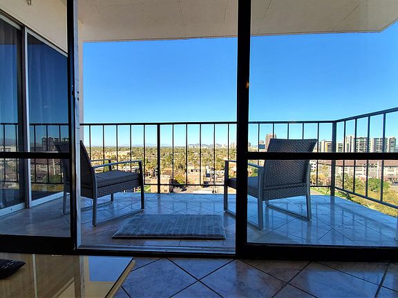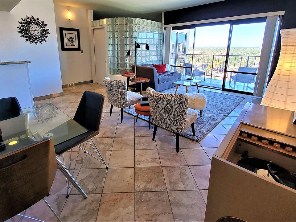 Take the elevator up to your 10th floor spacious and stylish mid century modern 1 bedroom condo with a full, updated kitchen and bath and marble tile floors. You will be safe here as there is staff on duty and private coded entry to the building. Equipped with Wi-Fi a 58" big screen Smart TV with cable and access to your own favorites like Netflix & Hulu. Soothing bedroom features a King bed. Access to gym, conference room, laundry room, and elevated outdoor pool at the third floor. There is no washer dryer in the condo. There is one covered parking space in the back . I can give access to another parking space across the street. One dog of 25 lbs or less allowed with permission. There will be a pet fee of $300 per month plus an additional refundable deposit of $300. This space has everything you would need to work, play, relax & enjoy all that downtown Phoenix has to offer. A thriving nightlife that starts with happy hour within walking distance of this 10th floor recently renovated, mid century modern gem atop the iconic Del Webb building. From the peace of your private balcony you can witness Arizona's breathtaking sunsets and then drink in the sparkling downtown skyline. You can be your own chef in the stocked kitchen or walk a block to CIBO or The Vig Fillmore and let someone else do the cooking. You are only a half mile from the light rail that can bring you to the convention center, Tempe and many other stops along the route. A quick 10 minute drive from Sky Harbor Int'l Airport too. Uber & Lyft are also convenient. You are just minutes to the convention center, ASU downtown campus, and the Phoenix Art Museum, to name just a few. Take an early stroll to an award winning coffee house, get your afternoon spring training game on at Chase Field and top the evening off with an art walk or gallery tour . Perfectly located close to several wine bars, global restaurants art galleries, and nightclubs, The Crescent Ballroom and The Van Buren are less than half a mile away if you want to check out a concert! Grab a coffee at Lola coffee or The Teapot, a 5 minute walk, if you prefer the barista flair! There are several local options for food and fun in the downtown areas including Comerica Theater, Talking Stick Resort Arena, Angels Trumpet Ale House, Bliss/ReBAR, FilmBar, The Valley Bar, Forno 301, Pomo, Pita Jungle, Phoenix Public Market, Matt's Big Breakfast, Sosoba, and Roosevelt Row just a quick walk away. Everything included- electric, wifi, water, cable, and linens. This is a full vacation rental. There will be an added refundable deposit of $400 to$1000 depending on length of rental. Available up to 12+ months.