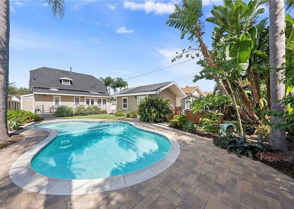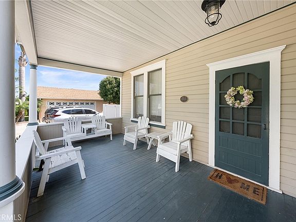 Located just 7 blocks from the Old Town Orange Plaza is this 2-story Dutch Colonial Farmhouse. Built in 1901, this orange grove house was part of Orange's rich heritage as a farming community. Set on a 6,534 sf lot, this home features 1,909 sf w/3 bedrooms & 2 full baths. From the front, you are greeted by a beautiful rose arbor. The 350 sf front porch is great for enjoying your morning coffee. As you enter the home, there is a spacious living room that leads to an eat-in kitchen with shaker style cabinets, subway tile backsplash, center island w/produce sink & wine fridge, combination butcher block & soap stone countertops & separate laundry porch. The 1st floor features hardwood floors throughout, a master bedroom, 2 large closets, a tastefully upgraded bathroom that boasts dual pedestal sinks, a large formal dining room & a hidden staircase that leads to the 2nd floor. Upstairs, offers a remodeled bath w/period finishes, 2 additional bedrooms w/a pass thru closet & original wide plank pine floors. Original double hung windows are throughout the home. The backyard is an entertainer’s delight, featuring a 500 sf deck overlooking lush landscaping & a sparkling pool. The 2-car garage & rear garden shed are great for storage!